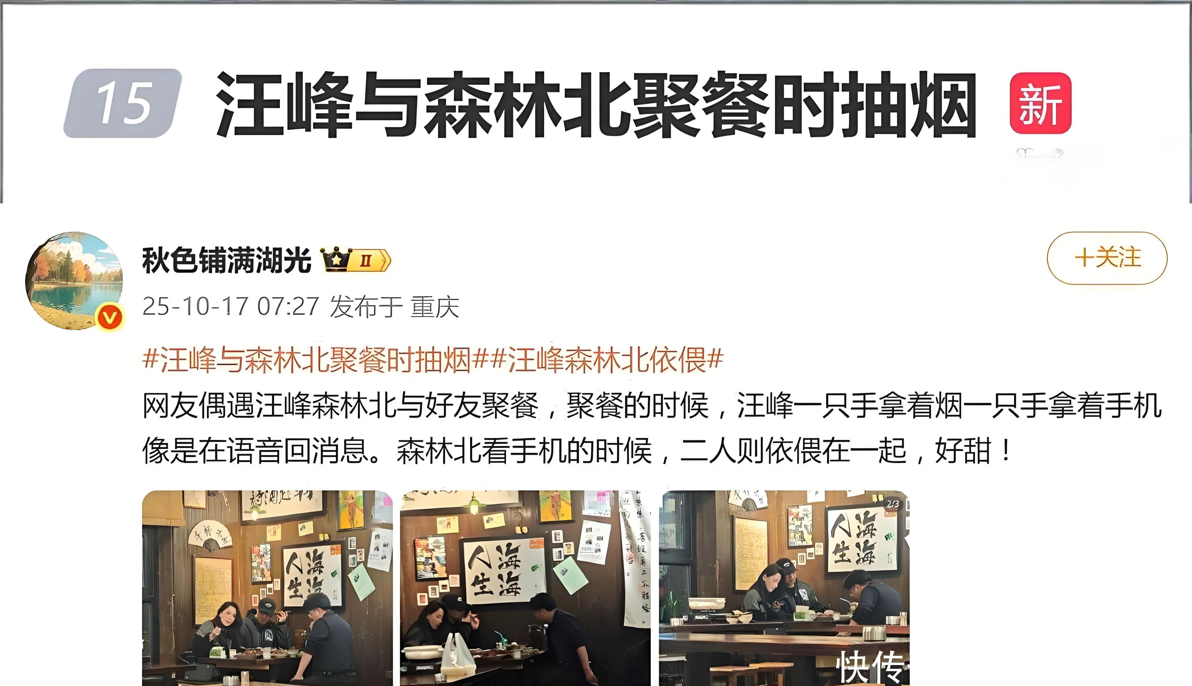 2025年10月16日,汪峰与女友森林北在新疆乌鲁木齐某餐厅聚餐的照片引发热议。